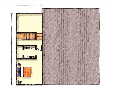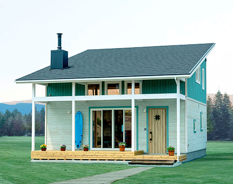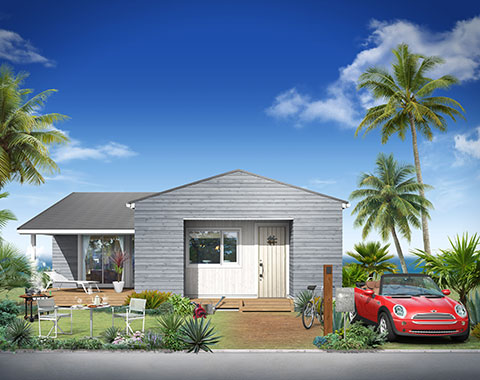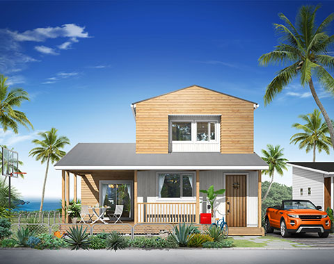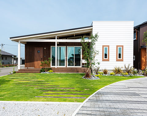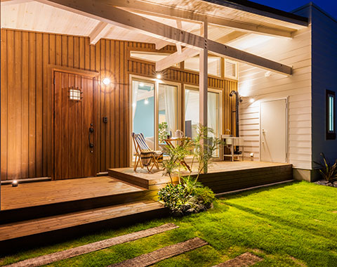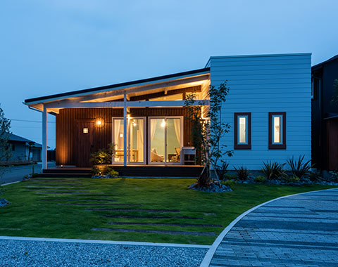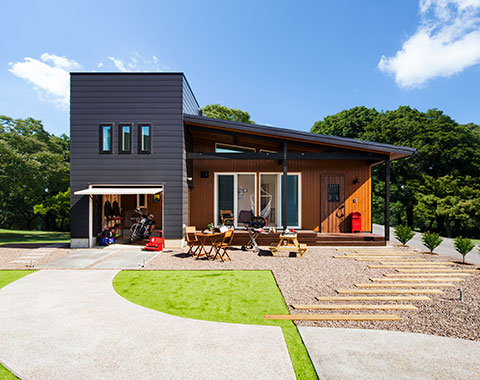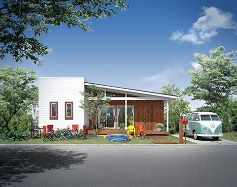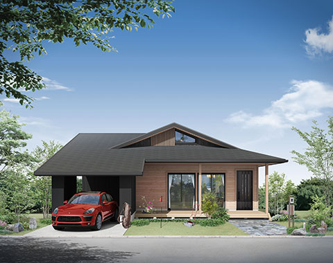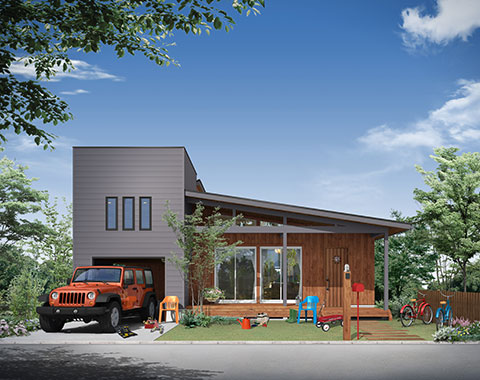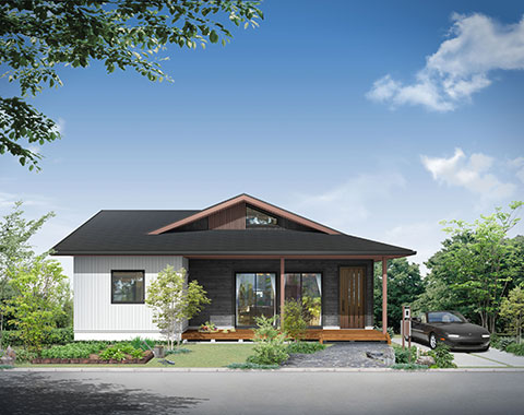 アメリカの平屋住宅をモチーフに、1.5寸の緩勾配の屋根が、現代の子育て世代にぴったりのシンプルでナチュラルなテイスト。北米の住宅によく見られる「フロントポーチ」からリビングにつながる部分が「土間」になっており、屋外と屋内の空間を一続きのように楽しめる「プラスα」の価値を生み出すデザインが魅力です。