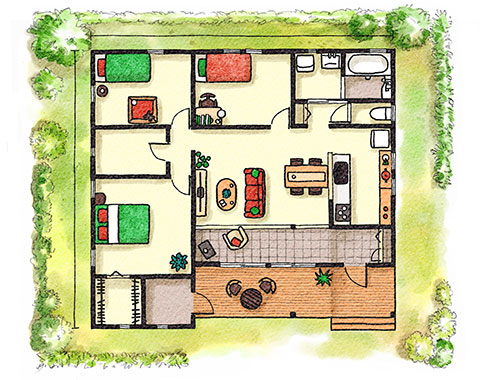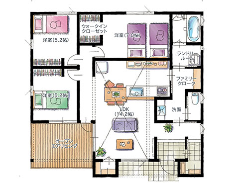 フラットな生活空間でのびのび暮らす、子育て世代に安心設計のフラットハウス(平屋)。