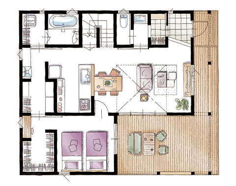 床・内装壁・外壁に天然素材の⽊を採用し、DIYやエイジングをお楽しみいただけます。省エネや耐震性能、制震システムなどを備えた⾼性能住宅です。